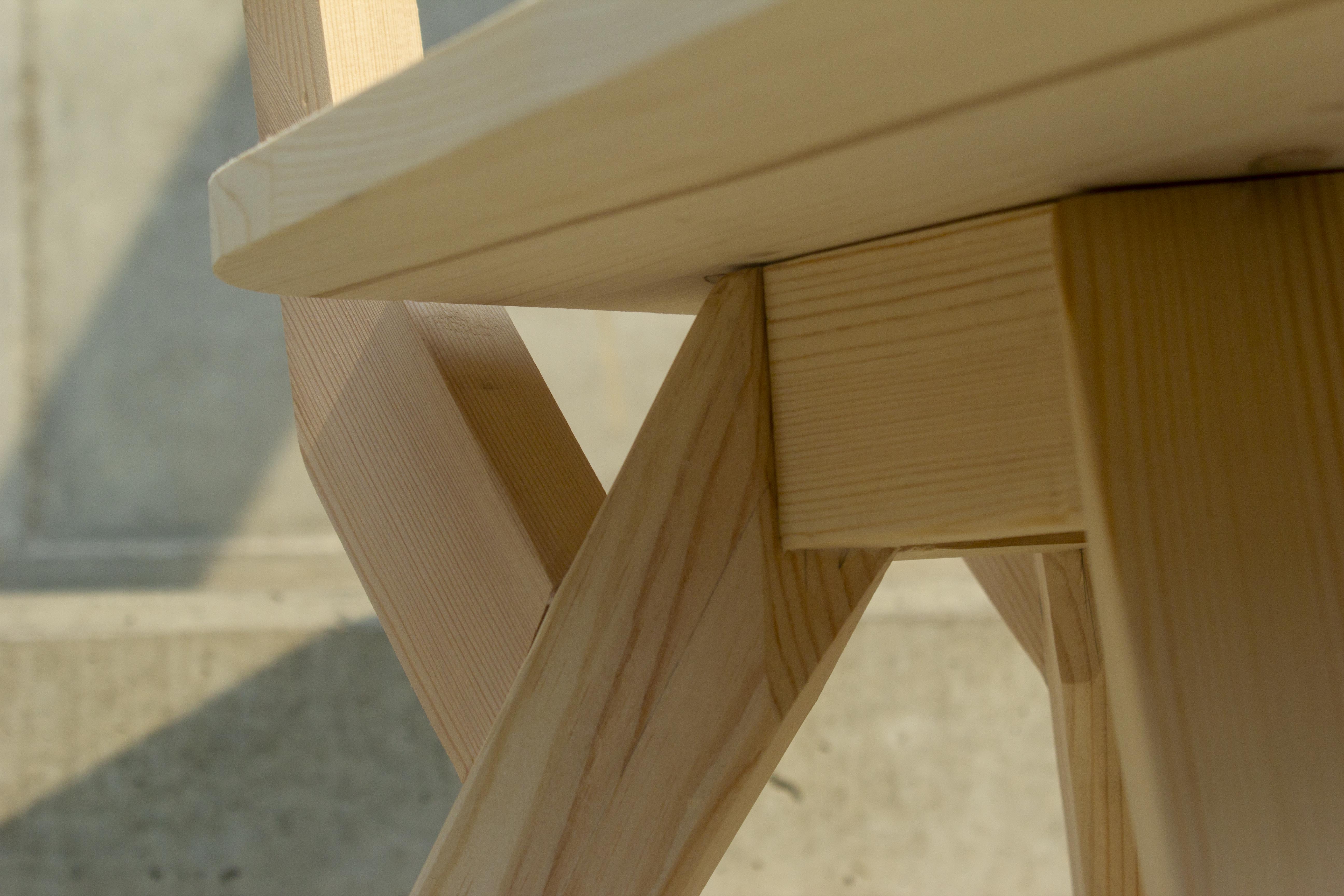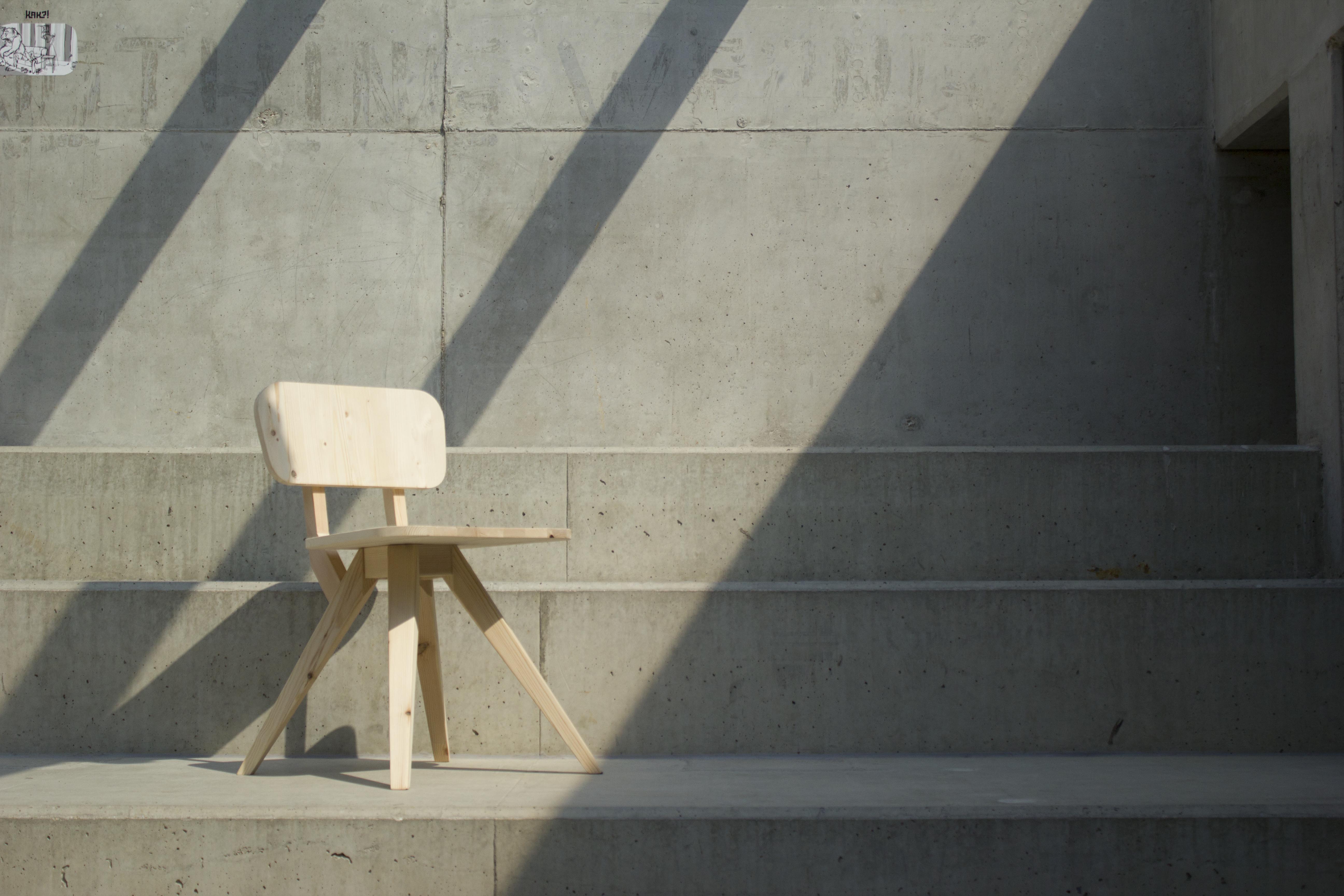 The chair is made entirely from wood, with a focus on simplicity and honest construction. By choosing a light type of wood, the piece remains easy to handle and move around, making it practical for everyday use. The lightweight material also helps highlight the structure and shape of the design. All of the connections are made using wooden pin-and-hole joints, which means that no metal was used in the construction. This approach keeps the chair true to the material and emphasizes traditional woodworking techniques. It also allows the different parts of the chair to come together in a clean and cohesive way. The design is defined by a series of carefully considered angles. These angles give the chair a slightly geometric and almost metal-like character in its appearance. At the same time, because it is made entirely from wood, the chair still feels warm, natural, and inviting. The contrast between the sharp lines of the form and the softness of the material creates a balanced and distinctive piece.